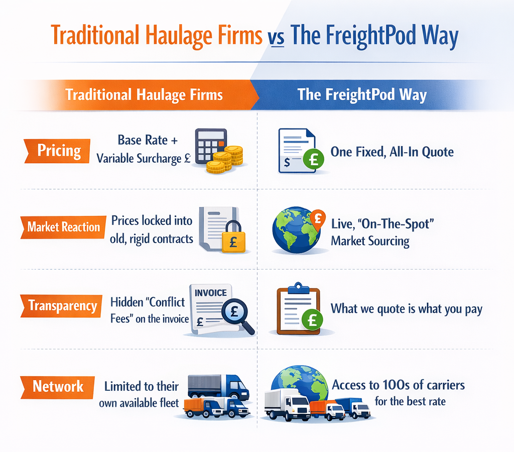 The situation in Iran has sent Brent Crude soaring, and traditional haulage firms are scrambling. They protect their margins by adding complex, fluctuating fuel pegs and "emergency" surcharges to your bill.